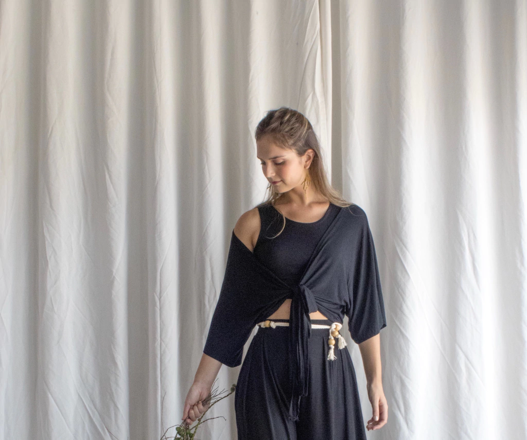 Blusa Transpassada Preta Ela é ideal para sobrepor qualquer look, pode ser usada transpassada como blusa ou amarrada na frente, para quando bate aquele friozinho pode ser colocada em cima de outra blusinha. O tamanho dela é único!! Serve bem em todos os corpos, pois é você quem amarra como quiser ela no seu corpo! Obs: Trabalhamos com tecidos de Refugo da indústria, então pode ter pequenos detalhes (que não são defeitos) nas peças. Recomendamos comprar a peça mais soltinha no corpo. Importante não use secadora na hora de secar sua peça.