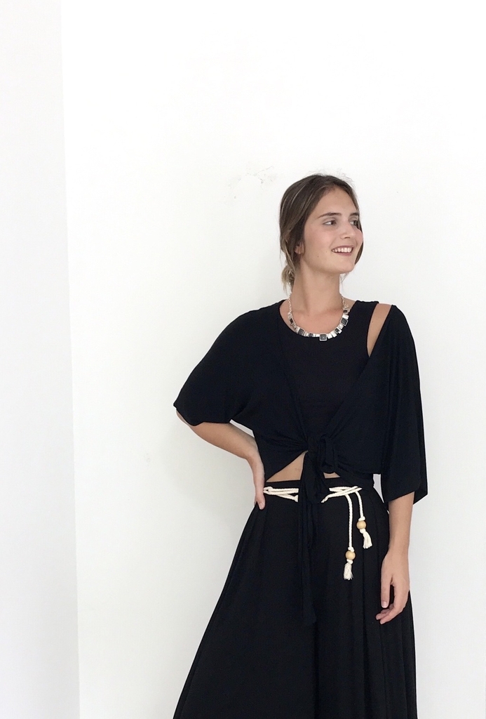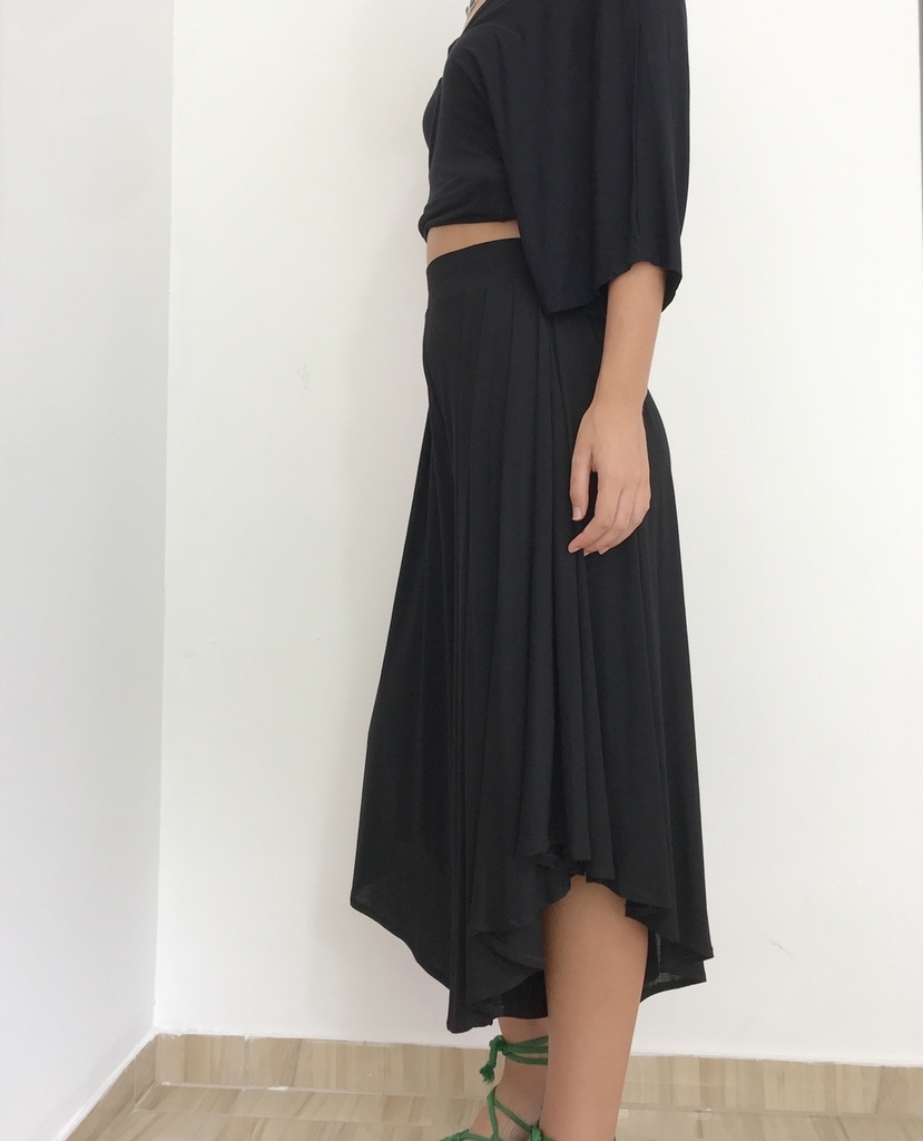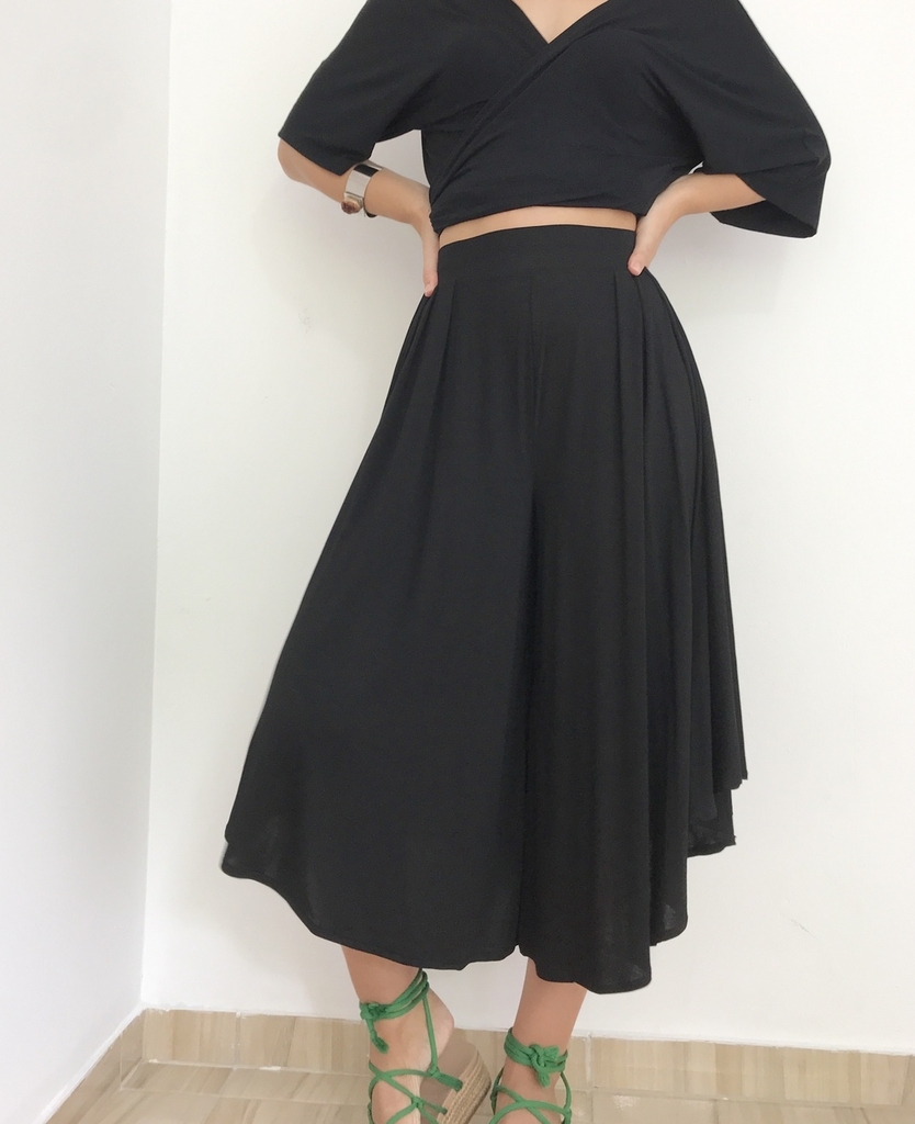 PANTACOURT ESSÊNCIA PRETA + BLUSA TRANSPASSADA Super ampla, confortável, para te deixar livre e permitir todos os seus movimentos. No cós é feita com elástico . A peça tem 3 pregras na parte da frente e duas na parte de trás, fazendo com que tenha um movimento e caimento incrível no corpo, com o caminhar quase parece uma saia.