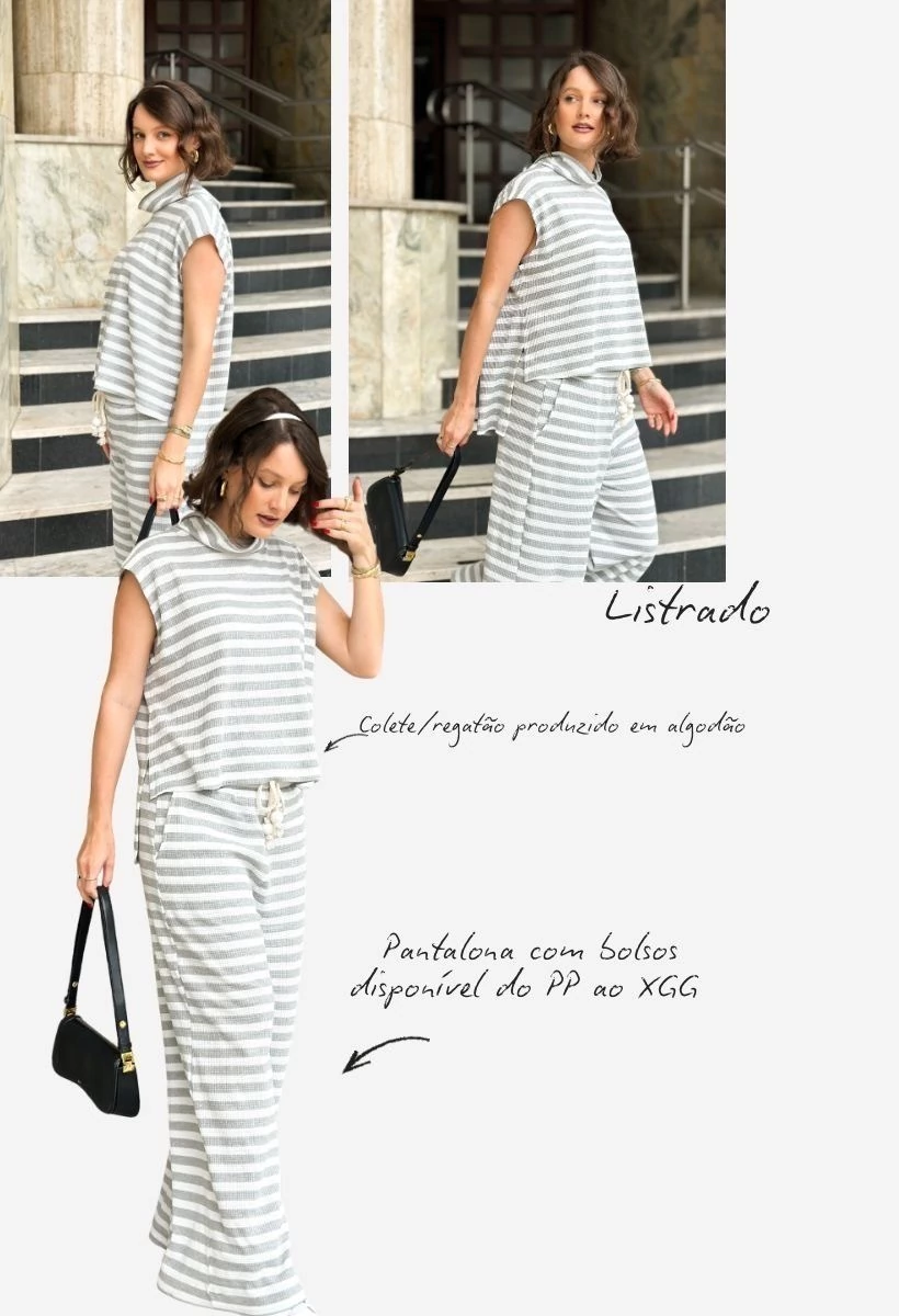 Pantalona Bolso Listrada , escolhida na numeração que você desejar e nosso Colete Regatão listrada, no tamanho único.