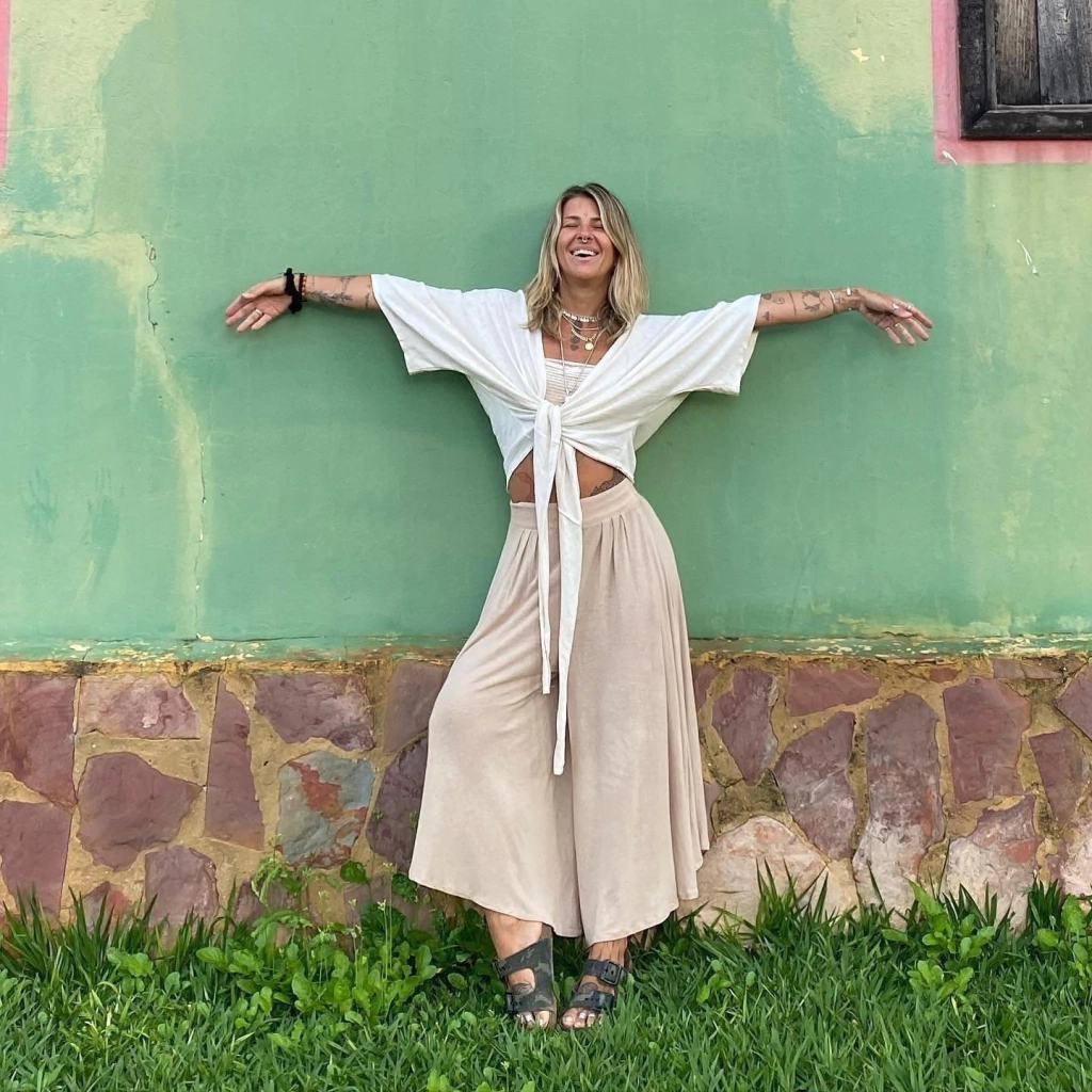 Pantacourt / Saia Super ampla, confortável, para te deixar livre e permitir todos os seus movimentos. No cós é feita com elástico . A peça tem 3 pregras na parte da frente e duas na parte de trás, fazendo com que tenha um movimento e caimento incrível no corpo, com o caminhar quase parece uma saia.
