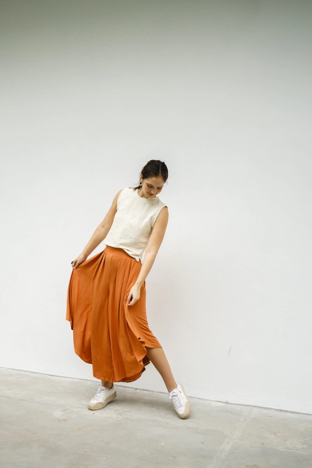 Pantacourt / Saia Super ampla, confortável, para te deixar livre e permitir todos os seus movimentos. No cós é feita com elástico . A peça tem 3 pregras na parte da frente e duas na parte de trás, fazendo com que tenha um movimento e caimento incrível no corpo, com o caminhar quase parece uma saia.